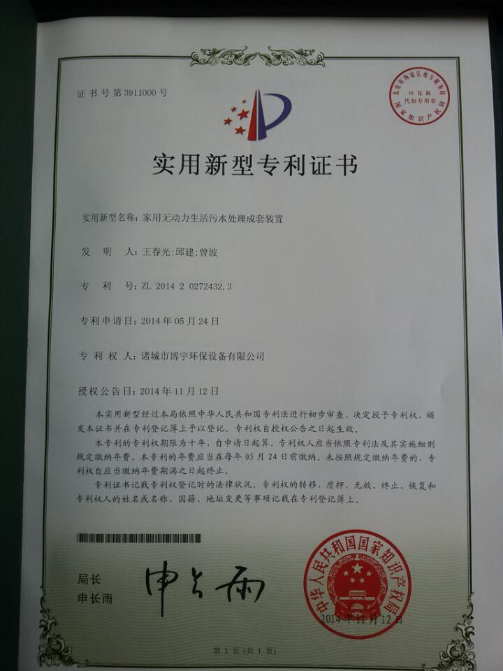 熱烈祝賀我公司申請(qǐng)家用無(wú)動(dòng)力生活污水處理裝置獲得成功。